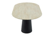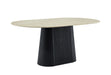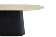 Das Gestell aus MDF in Schwarzoptik ist ein echter Blickfang. Die dänisch-ovale Form mit vertikalen Linien verleiht dem Tisch eine moderne, handwerkliche Note. Das dunkle Holz bildet einen harmonischen Kontrast zur hellen Travertinplatte und sorgt für Wärme und Tiefe.