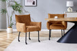 Un avantage pratique majeur de la chaise de salle à manger OURIER réside dans ses roulettes solides de type skate fixées aux pieds en métal. Celles-ci permettent de déplacer la chaise facilement et en douceur, sans abîmer le sol. Cela la rend idéale pour un usage quotidien et particulièrement pratique pour les grandes tables ou lorsque la flexibilité est souhaitée. Les pieds en métal noir apportent une touche moderne et robuste et créent un contraste élégant avec le revêtement Cognac doux.